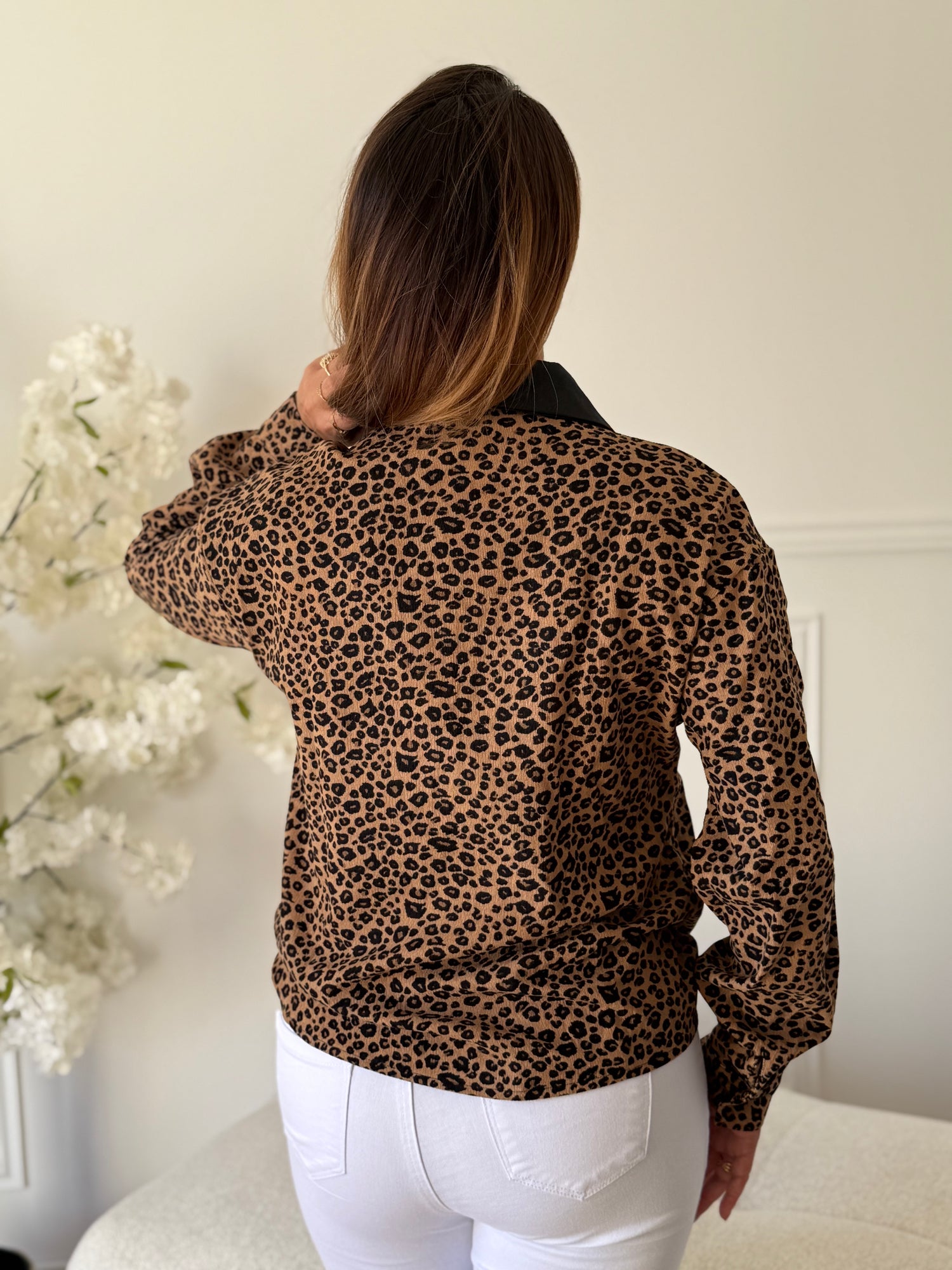 Découvre le véritable coup de coeur de la saison : la chemise "Billie" avec motif léopard et son col en simili-cuir noir.