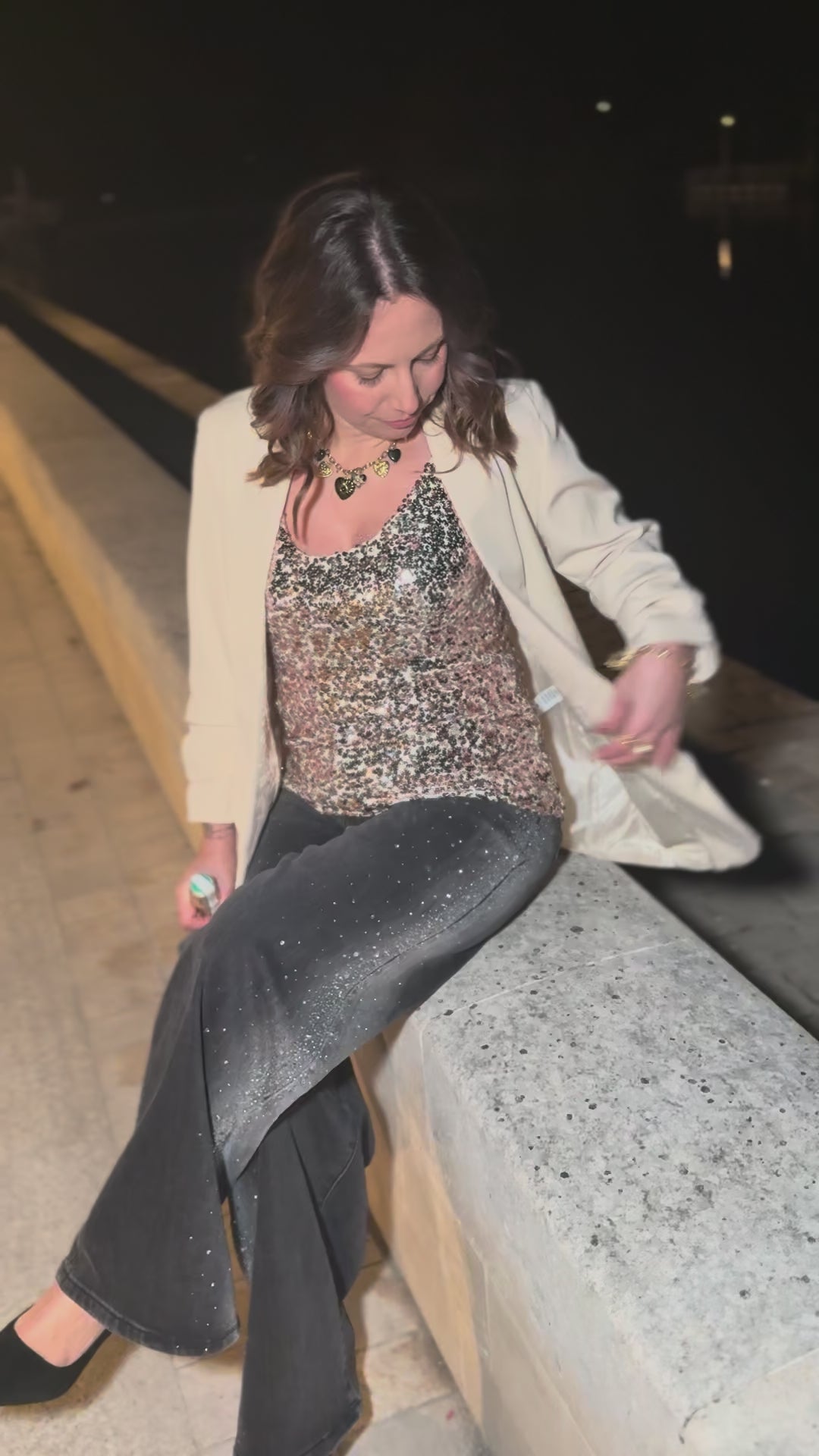 Un débardeur scintillant entièrement recouvert de sequins, avec une doublure douce pour un confort parfait. Chic, lumineux et facile à porter, il apporte immédiatement une touche glamour à votre tenue. Parfait pour vos soirées ou pour briller au quotidien ✨
