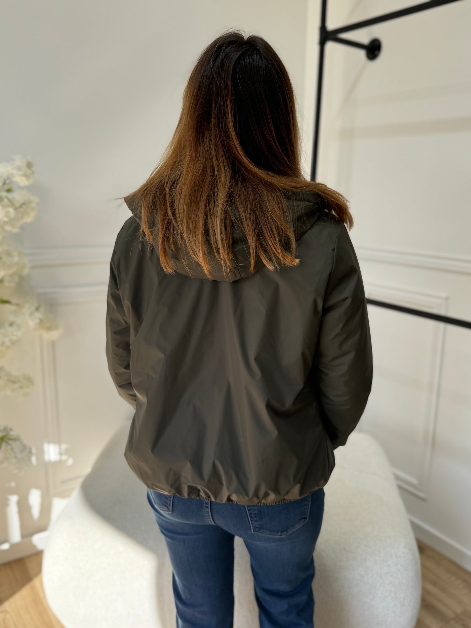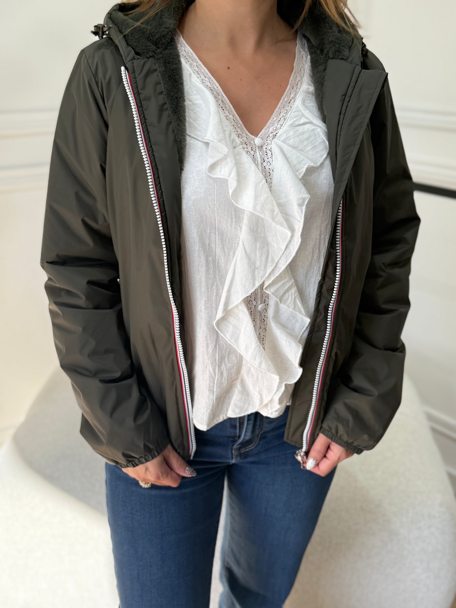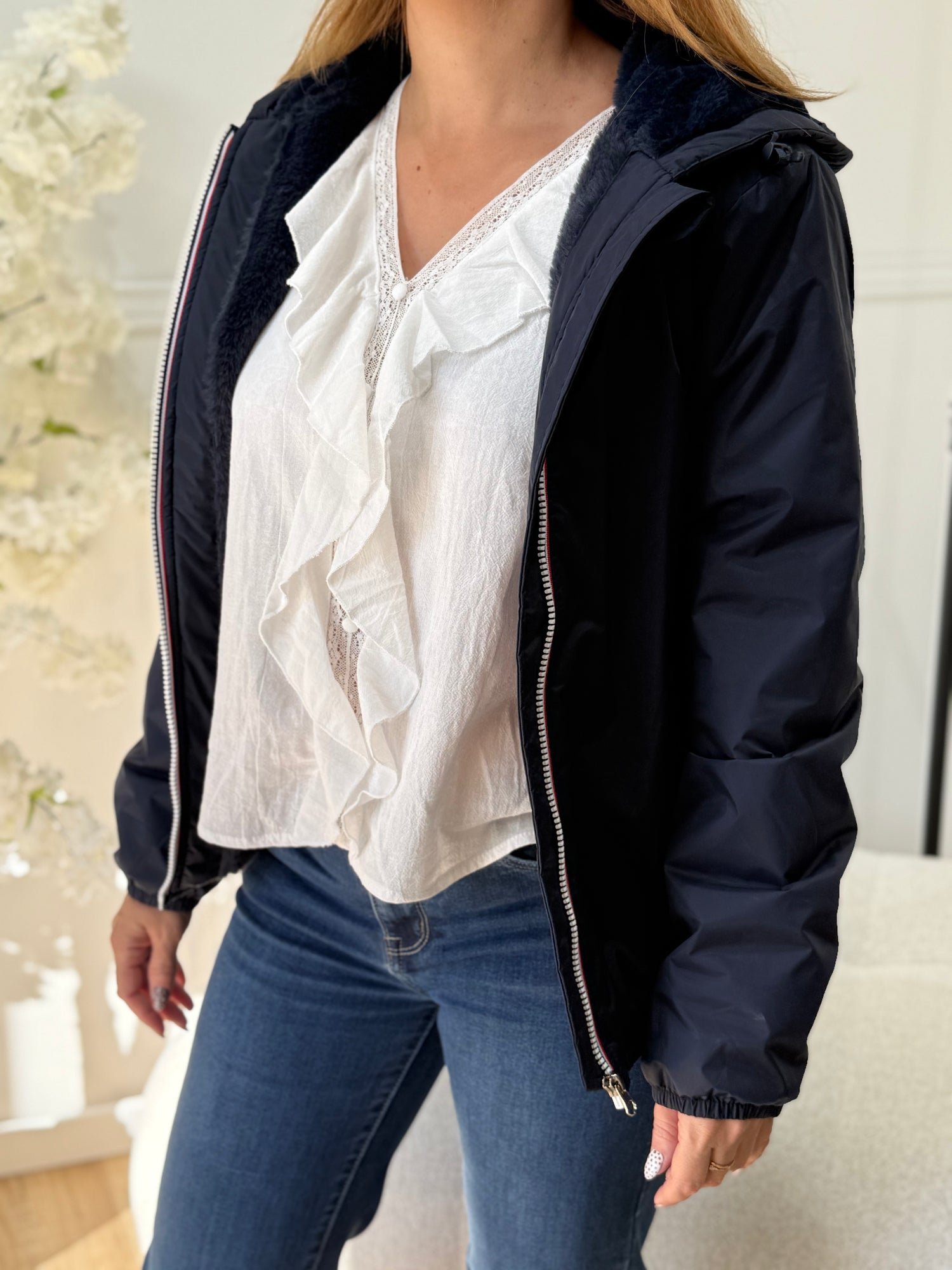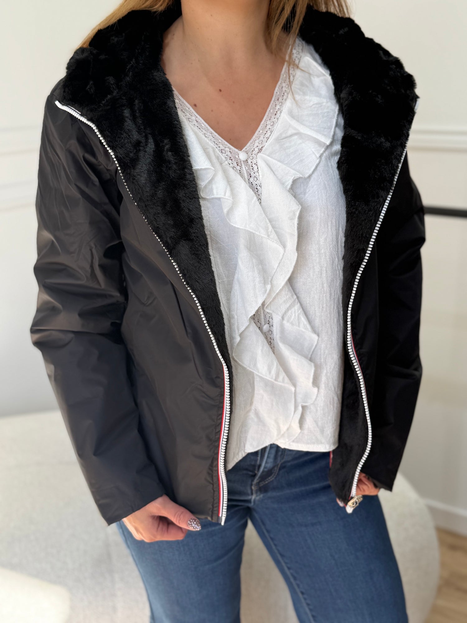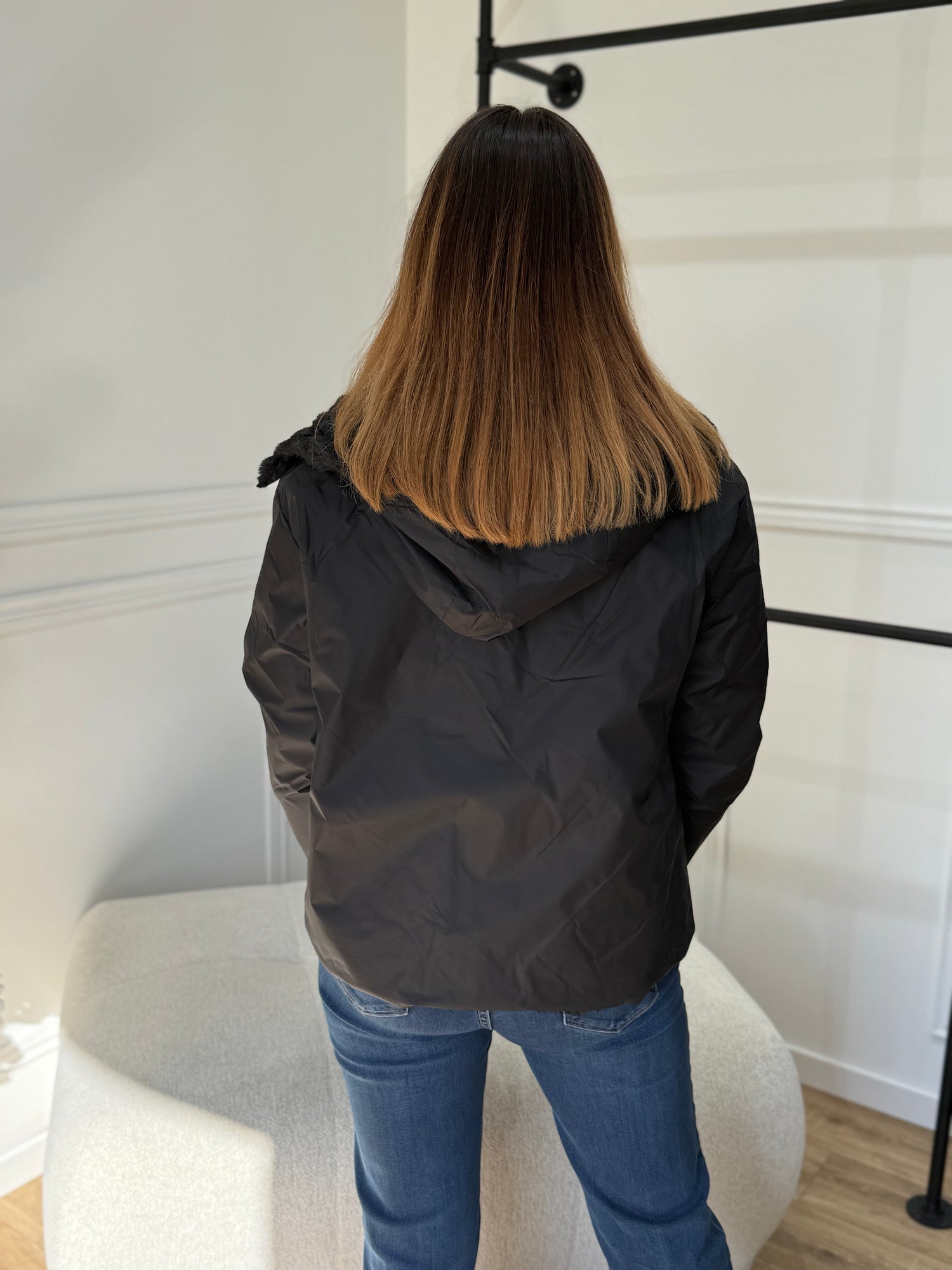 Alliez style, chaleur et praticité avec ce manteau court à matière K-way et intérieur fourré.