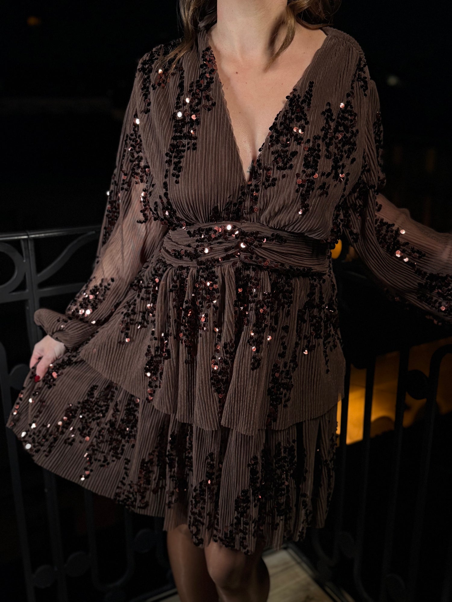Les sequins dorés illuminent la tenue pour un look chic, féminin et irrésistible.