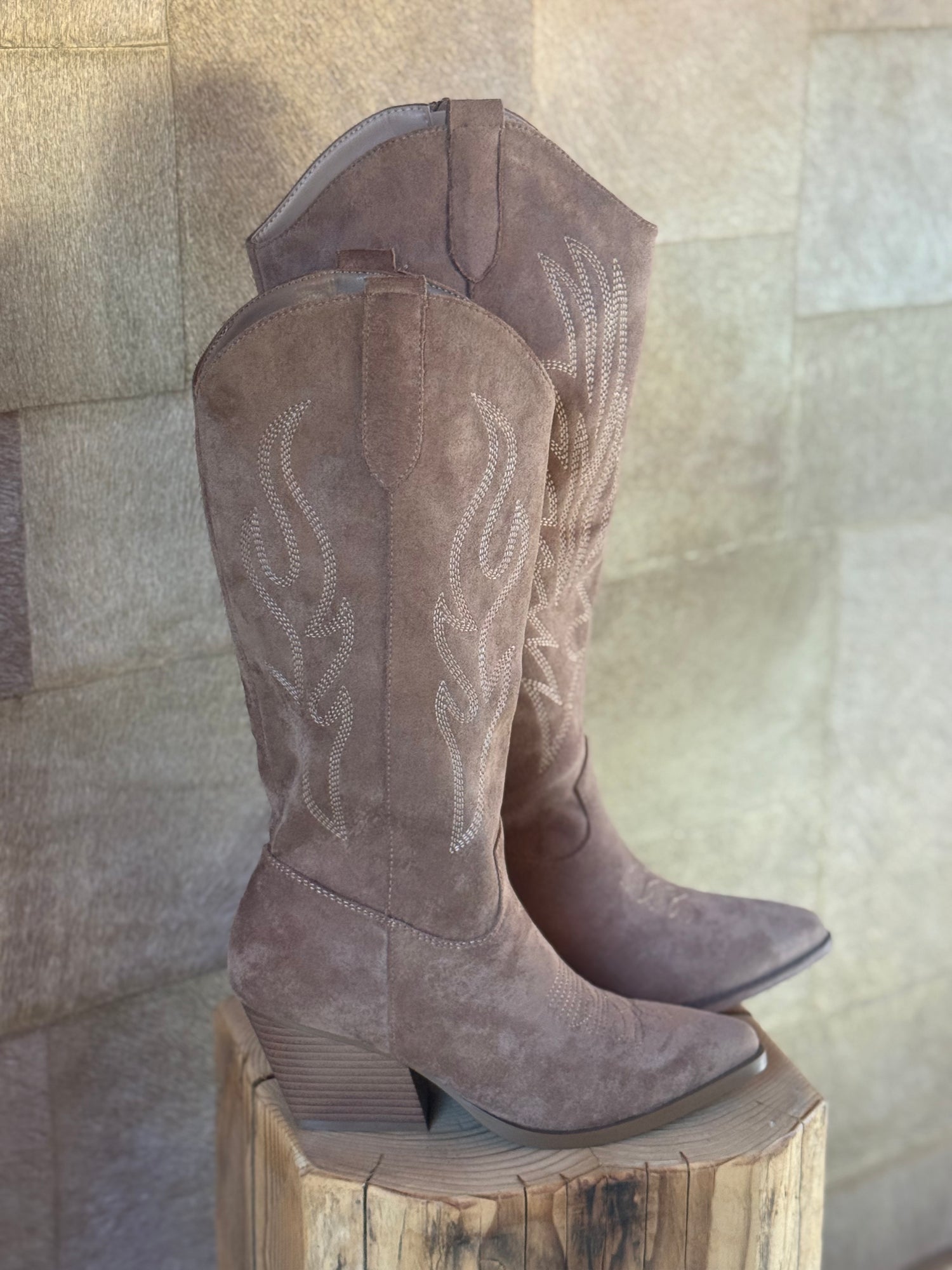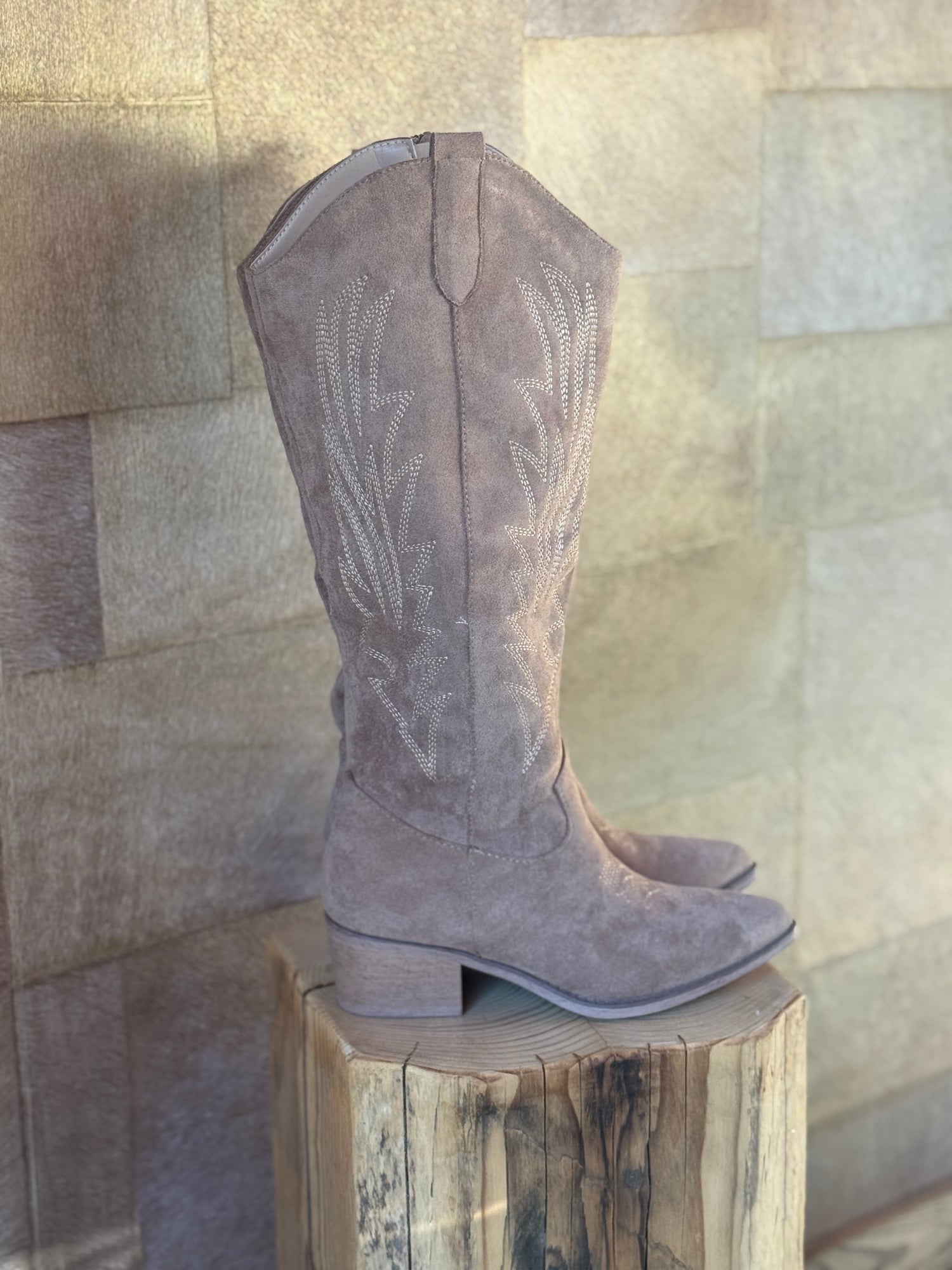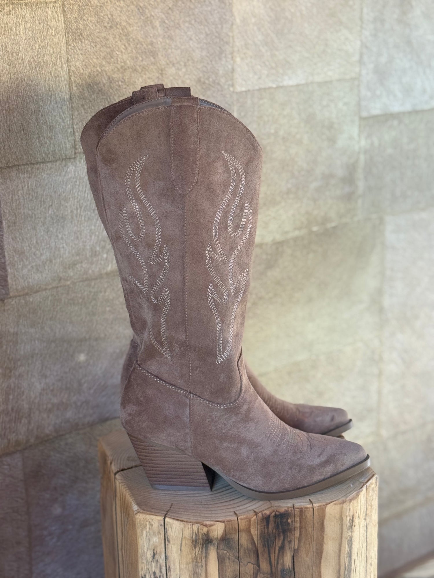 Coup de coeur pour les Santiags effet "daim" couleur taupe qui se mariera avec vos looks d'automne/hiver