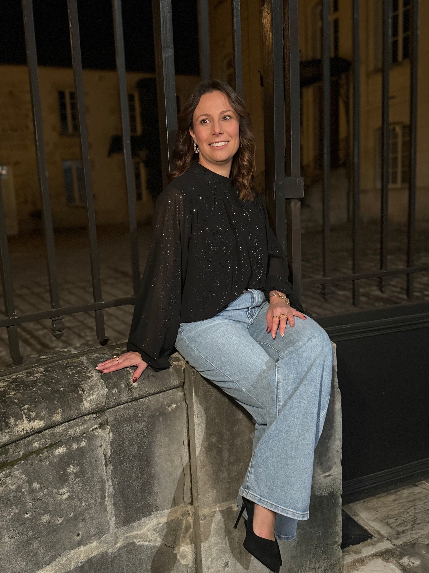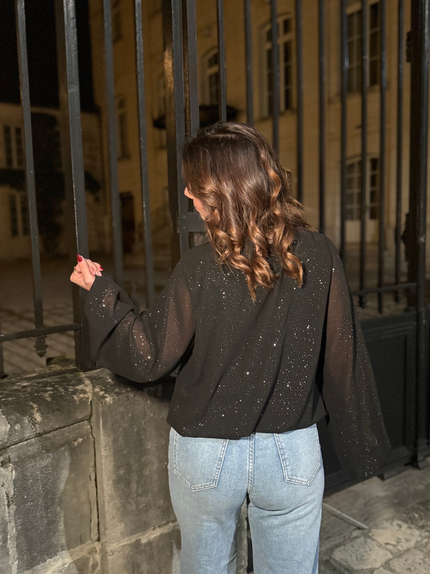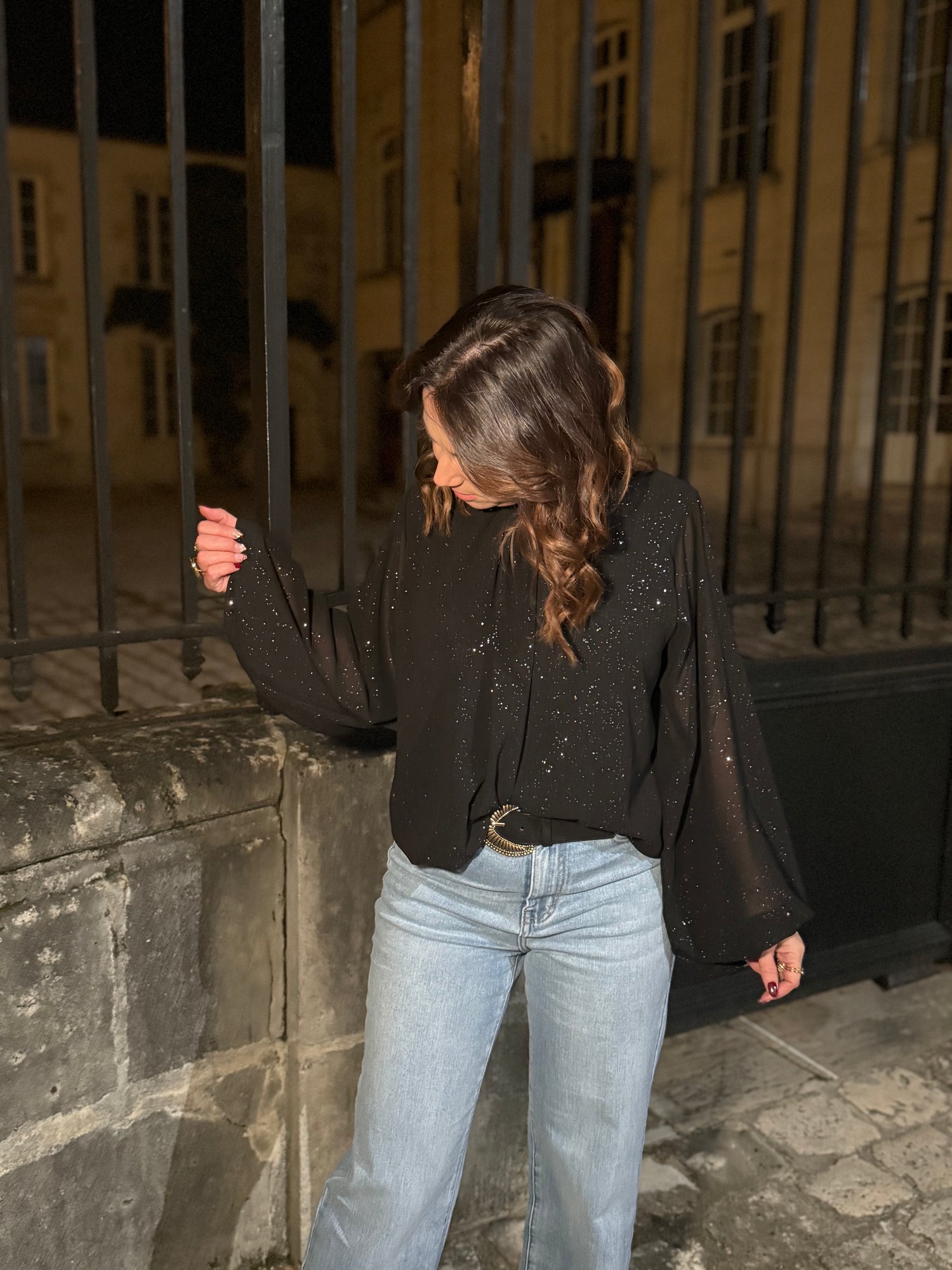 Top noir léger et fluide, sublimé de paillettes argentées. Ses manches longues amples et transparentes apportent une touche chic et élégante. Taille unique confortable, idéale du 34 au 42. Parfait pour briller avec style ✨
