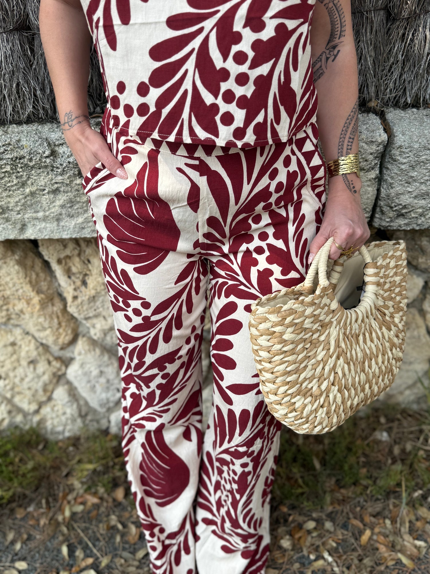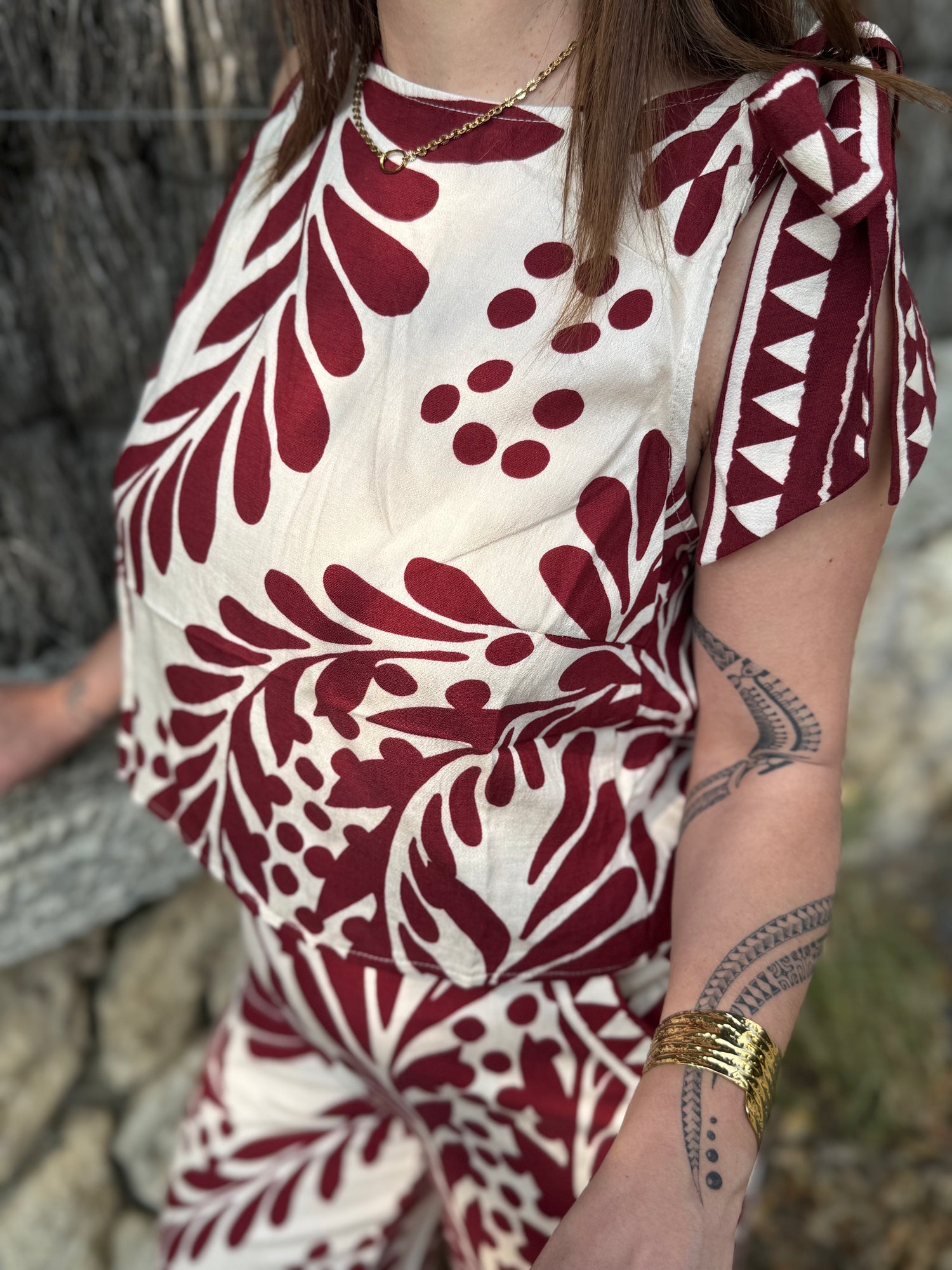 Crop top style ethnique aux tons bordeaux, parfait pour un look estival et féminin. Sa coupe courte et son design sans manches apportent légèreté et modernité.